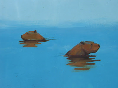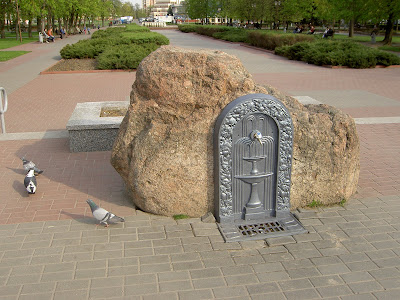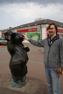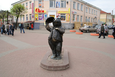 А в 1949 году ЦК КП(б)Б направил прошение секретарю ЦК ВКП(б) Маленкову в честь 70-летия Сталина позволить, кроме всего прочего, переименовать Бобруйск в Сталинск, а Бобруйскую область — в Сталинскую. Кстати, название города по-русски Бобруйск, по-белорусски Бабруйск. Как, впрочем и Масква -) Поселились в гостинице "Бобруйск" в самом центре города. Нормальный такой Советский отель. Его фотография украшает все карты и путеводители по Бобруйску. В холлах стоят статуи Советских персонажей. Цена номера - от 350р за одноместный до 1400 за двухкомнатный люкс. Один минус - в номере было холодно. Напротив гостиницы - замечательное заведение "Чырвоная вежа", расположенное в водокачке. У них есть сайт с меню и ценами: http://www.bobruiskvodokanal.by/R_index.htm. Такого выбора блюд я не видел, наверное, нигде! Одного мороженого видов 30, не меньше. По мимо стандартных европейской и итальянской присутствует белорусская и болгарская кухни. Готовят все очень вкусно а с 1 мая открыта уличная часть в уютных беседках. Кафе пиццерия с уютным внутренним двориком, расписанным под морское побережье. Бронзового бобра, одетого в сюртук и шляпу, установили в старой части города, у входа на городской рынок. Место выбрано не случайно - по словам создателя памятника Владимира Гавриленко, особый колорит Бобруйску придавали жившие здесь еврейские торговцы, и бобр представляет собой одного из них. Слушая скульптора, «продвинутые» пользователи Интернета ухмылялись - фраза «Ф Бобруйск, жЫвотное!» давно стала крылатой, поэтому известность памятнику обеспечена. Мало кто откажется навестить легендарное жЫвотное и сфотографироваться с ним рядом. Еще одна статуя бобра у ресторана Корчма, в котором мы замечательно поужинали, продегустировав блюда национальной кухни. Цены по сравнению с Москвой меньше раза в 2, так что заказывать можно чо угодно на цену не глядя ;) Здесь я попробовал замечтательное белорусское блюдо - Колдуны. Это что то вроде драников, но с начинкой из мяса. Подают их в горшочках, со сметаной.