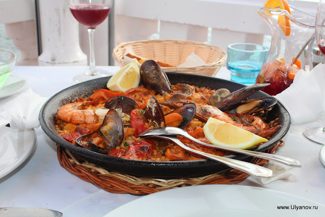 Порция рыбного супа оказалась горшком размером с кастрюлю с осьминогами мидиями и тигровыми креветками. А потом принесли паэлью...