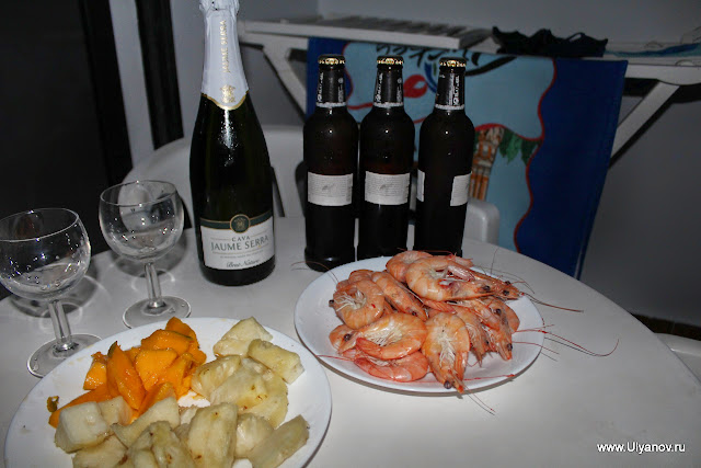 Ужинали через раз - или в одном из многочисленных ресторанчиков или дома. Заезжали на машине вечером в Меркадону - большой универмаг в торговом центре San Eugenio. Лично я на ужин брал там себе кило свежезамороженных тигровых креветок и вкусного пива :)