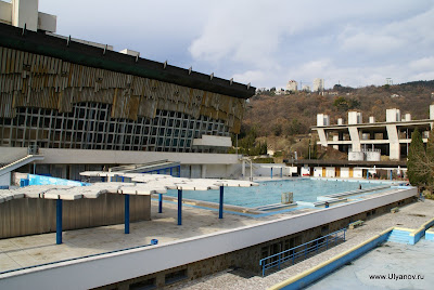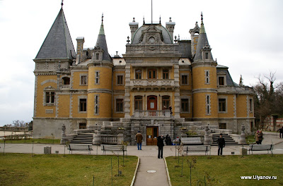 Вид на гостиницу из Массандровского парка Вид на гостиницу и Ялту по дороге в Массандровский дворец Смотровая площадка ресторана "Ай-Петри" на 16 этаже. Отсюда открывается захватывающий дух вид на море горы и Ялту. А такими штучками здесь потчают Бассейн и дельфинарий. Необычное здание перед гостиницей - ресторан Хрустальный. Какой же кайф вечерком купаться в теплом бассейне с морской водой, дышать чистым Крымским воздухом пропитанным запахом сосен и моря и любоваться горами вокруг, особенно когда никто не запрещает пить шампанское :))) Так меряют детей при входе в дельфинарий Недостроеный 2-ой корпус отеля "Ялта". Здесь проходят игры в пейнтболл - видны следы от разрывов краски. Здание не охраняется но на верх просто так не залезть - лестниц просто нет. В Массандровском паркеМассандровский дворецАлупкинский дворцово-парковый музей-заповедник. Официальный сайт. Массандровский дворец.Wikimapia Статья в Википедии Массандровский дворец императора Александра III находится прямо над гостиницей. Пройти в него несложно. По дороге до развязки с шоссе, потом еще с километр вверх. Музей работает летом с 9 до 18, понедельник — выходной. Зимой с 9 до 17, понедельник, вторник — выходные. тел. +38 0654 235347. Химеры еще и токсичны Кадр из фильма "Сердца трех" и дворец сегодня.
