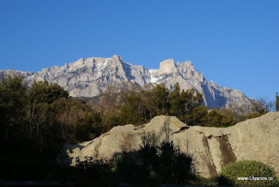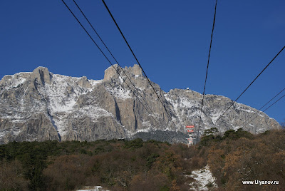 Канатная дорога "Мисхор - Ай-Петри" - официальный сайт. Здесь есть информация о цене билетов, времени работы и способах добраться до канатки. Вид который открылся с плато захватывал дух. Морозный воздух был кристально прозрачен и виден был весь Южный берег Крыма, покуда хватало взора. "Маленький посёлочек" внизу - город Ялта. А "небольшой холмик" в море - Аю-Даг, "Медведь-гора". Недавно открылась для доступа пещера Ялтинская. Она расположена 500 метрах от верхней станции канатной дороги. Была обнаружена случайным образом в 1997 году. История обнаружения пещеры такова. Мальчик кидал в расщелины камни. Кинув камень в одну из расщелин, услышал, что он падает достаточно долго. Придя домой, он рассказал об этом своему отцу. Тот, в свою очередь, с друзьями сходил на то место, спустился в низ и обнаружил пещеру. После обследования Ялтинская пещера была законсервирована. Позже вход был завален различным мусором. В 2007 году (21 июля), спустя 10 лет после открытия, спелеологи Владимир Киевский, Сергей Елисеенко и Иван Бондарь на свои средства расчистили и восстановили вход в пещеру, проложили экскурсионный маршрут, сделали освещение. Протяженность пещеры составляет 180 метров. В Ялтинской пещере сохранились сталактиты и сталагмиты, натечные образования и каменные цветы. "Зубцы" Кадры из фильма "Лиловый Шар"