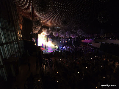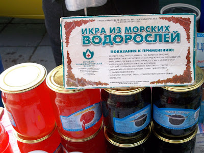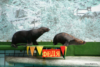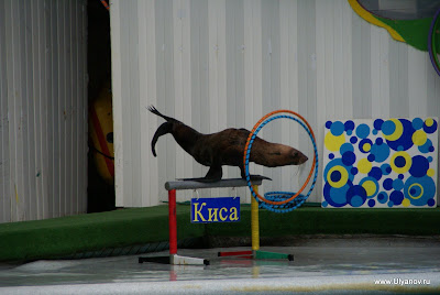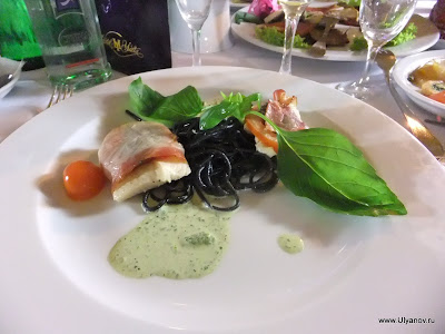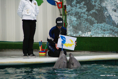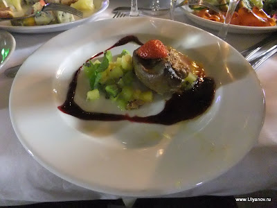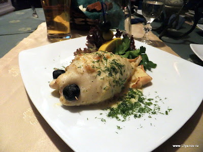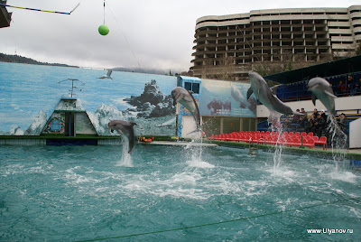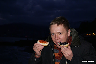 При гостинице "Ялта-Интурист" находится Ялтинский Дельфинарий. Представление в сезон проходит каждый день в 14 часов. Входные билеты стоят 50 гривен обычные, без мест, и 60 VIP с местами под крышей и рядом с бассейном. Выступают 4 дельфина и морские котики. Вся эта веселая компания играет со зрителями, ловит мячики, танцует, поет и даже рисует. Во время представления нарисованную картинку можно купить на импровизированном аукционе, победителю которого получит еще и возможность прокатиться с огромной скоростью в лодке, ведомой дельфином. После представления предлагается за отдельную плату сфотографироваться с дельфинами и поплавать с ними в бассейне. Последний вечер. При съемке данного кадра ни один осётр не пострадал. Ещё в поезде барыги достали предложениями капить "настоящую" чёрную икру. Будте бдительны! Увидев её в Ялте по цене не вызывающей жадности я не удержался, чтобы не попробовать Съедобно, кстати :)