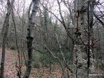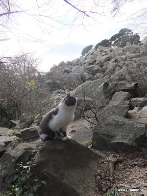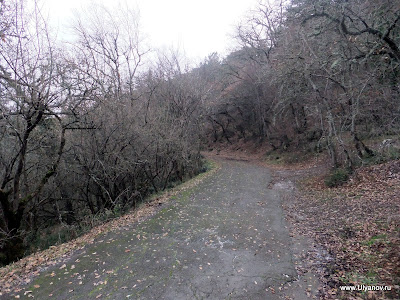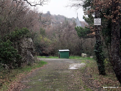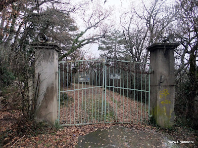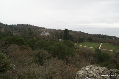 Массандровские гротыИнтересны тем, что сюда (согласно литературных источников) ходила молиться Мария Александровна - покинутая императрица - жена Александра II. С этой поры в одном из гротов в скале выбит крест. Добираться до них можно так: идти к Массандровскому дворцу дорогой, по которой водят все группы. Не доходя 30 метров до ворот, за которыми Большой луг, сворачиваем влево под газовую трубу на тропу. Тропа вскоре приведет к бетонным столбам – остаткам забора. Выходим за территорию парка и поднимаемся по тропе на асфальтовую дорогу у ворот. Дорога соединяет первый километр Романовского шоссе и дворец. Продолжаем движение в прежнем направлении. Метров через 30 глыбовый навал. Воронцовский грот - вправо немного вниз. Потом на развилке влево. Нужен фонарь. Другой сквозной грот наверху, там же смотровая. К ним ведут ступени. Остатки колючей проволоки на остатках забора. Идем верно! Доходим до заброшенной дороги и ворот. Забора нет, на воротах остались страшные таблички и глазницы фонарей. Видимо это и был основной въезд на госдачу. Верхний вход на территорию до сих пор охраняет собачко. В одном из гротов при свете луча фонаря можно рассмотреть большой каменный крест. Поднявшись по каменной лестнице и пройдя по горной тропке на самый верх оказываешся на скалистой вершине откуда открывается замечательный вид на Массандровский дворец, море и Ялту. Фото с дореволюционной открытки