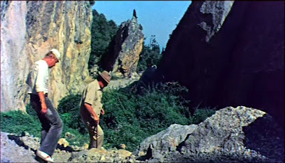 Это место использовалось и при съемку многих фильмов. Вот, например, кадры из фильма "Спортлото 82", в которых оно засветилось. Эпизод, где Сан Саныч и Стёпа сбивают таблички со столба а Костя, Таня и Павел их прибивают обратно. Забавный момент. Следующий столб, где маршруты сходятся, расположен уже на горе Демерджи, у знаменитого Никулинского ореха.