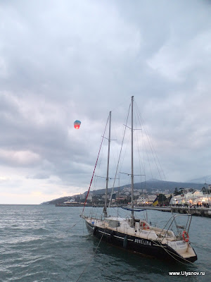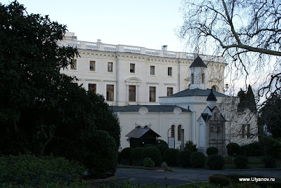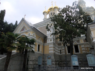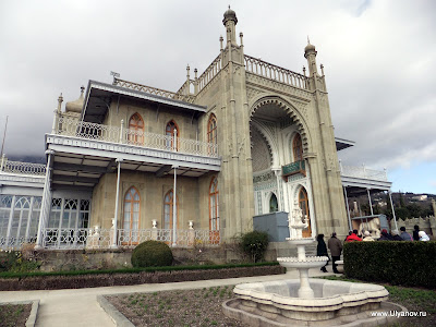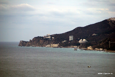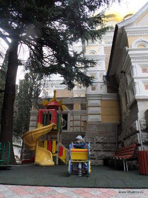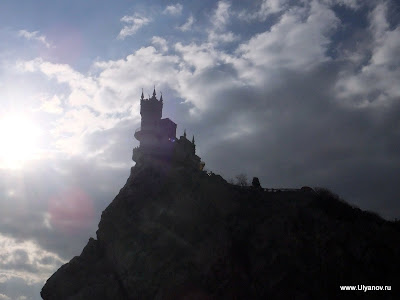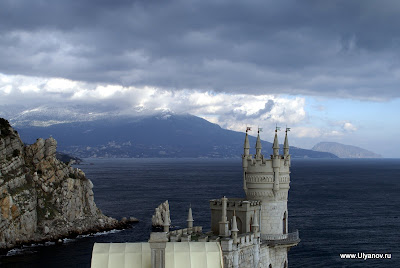 Собор Святого Александра Невского и детская площадка. Прямо как игровая комната в мега-моле. Ласточкино ГнездоЗамок Ласточкино Гнездо можно назвать символом Крыма, настолько узнаваем его силуэт на фоне горы Аю-Даг и моря и настолько прочна ассоциация с Крымом этого вида. Добраться можно как по суше так и по морю. Второй вариант конечно намного приятнее. Летом каждый час ходит рейсовый катер по маршруту Ялта - Алупка с остановками в Ливадии, на Золотом Пляже и у Ласточкиного гнезда. Зимой же раз в день дают экскурсионный катер. Он идет около получаса до Гнезда, по дороге проводится аудио-экскурсия, есть 40 минут чтобы прогуляться наверх и назад. Стоит такая прогулка 60 гривен, отправление было 11-20 от Ялтинского причала На входе собирают еще по 5 гривен не понятно на что. Еще лет 10 назад я высказал поборщикам, что я думаю по этому поводу - несмотря на поборы на небольшой скале все было завалено мусором, денег на то, что бы хотя бы раз в неделю убраться не выделялось. Сейчас почище, почище. Ласточкино гнездо в XIX веке