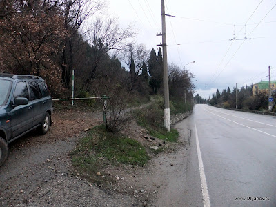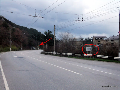 Как до неё добраться показано на фото ниже и на карте вверху страницы. Доезжаем на троллейбусе до остановки "Санаторий Сосняк" и идем по направлению от Ялты метров 700 до зеленого шлагбаума.